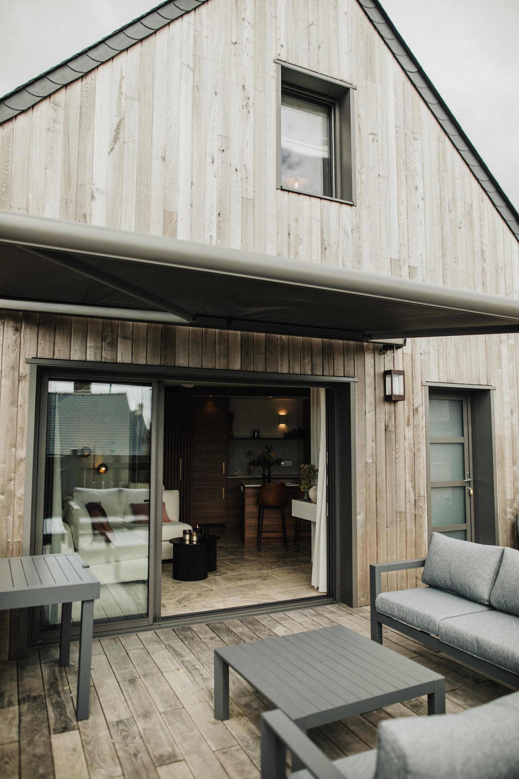 Porte de garage PVC composée de deux portes battantes et d’un châssis fixe. Gamme PRELUDE – Teinte PVC : Gris anthracite lisse